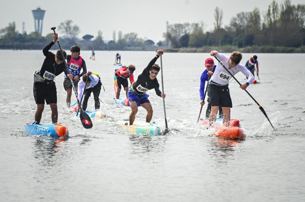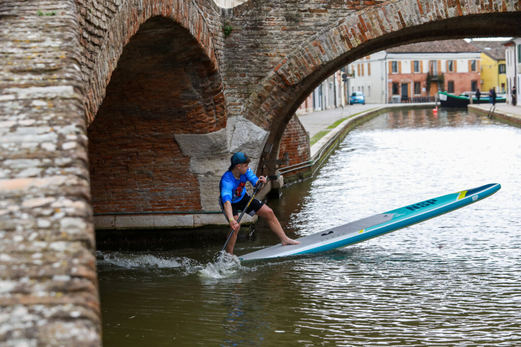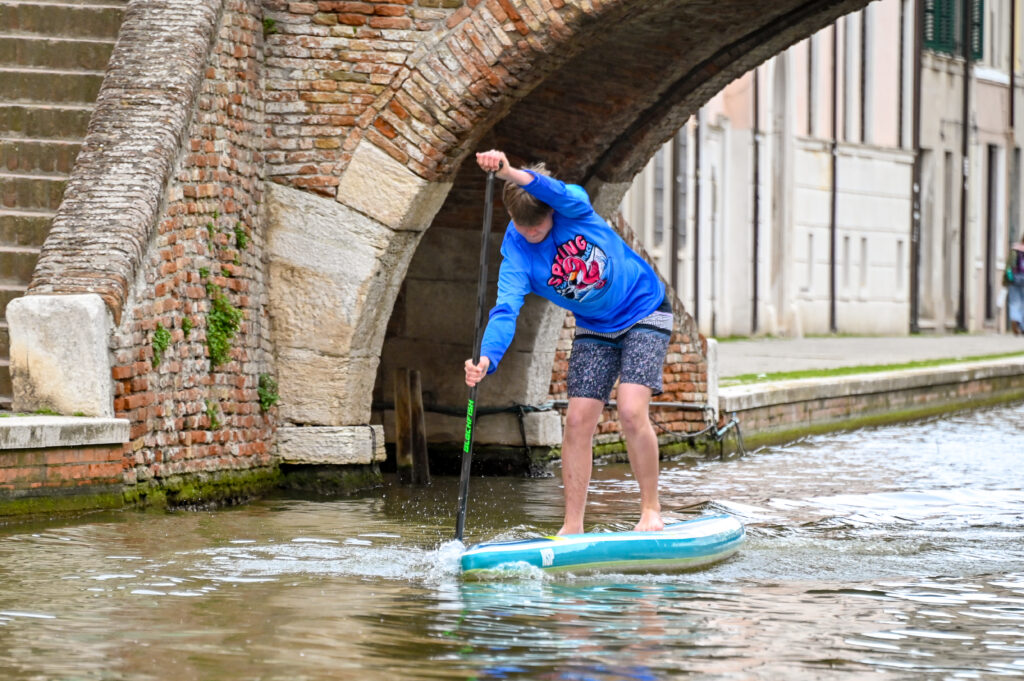 L’evento è iniziato venerdì pomeriggio con una Crono all’interno dei suggestivi canali di Comacchio che si è corsa a bordo di tavole gonfiabili monotipo.